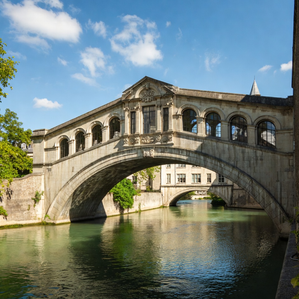 A picturesque stone arch bridge spans a calm green river under a partly cloudy blue sky. The bridge features ornate arched windows and decorative stonework on its facade. Lush green trees and ivy frame the sides, with additional bridges visible in the background.