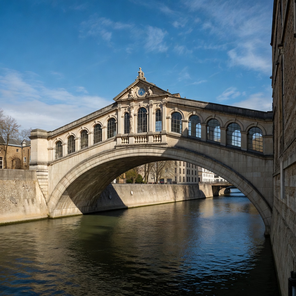 A historic stone arch bridge with ornate windows and balustrades spans a calm river. The bridge features classical architecture with arched windows and a decorative pediment. Surrounding stone buildings and trees frame the scene under a partly cloudy blue sky.