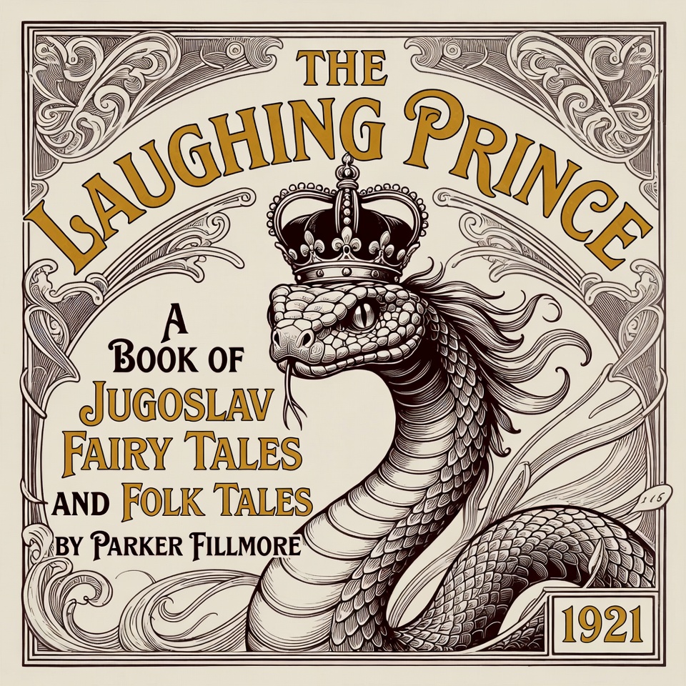 1921, art nouveau, beige background, coiled snake, crown, decorative borders, fairy tales, flowing hair, folk tales, gold tones, illustration, jugoslav, laughing prince, ornate, parker fillmore, serpent, snake, title design, vintage, book cover