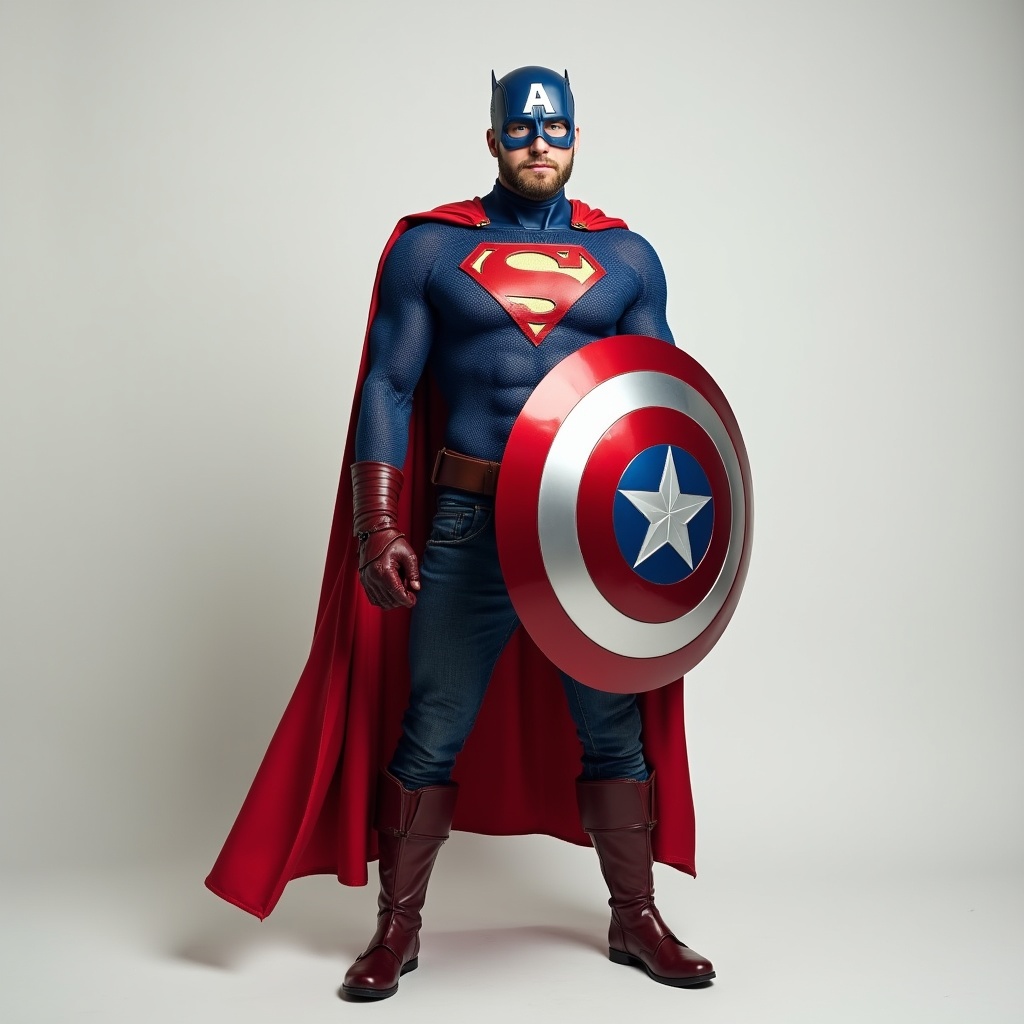 A muscular man stands confidently on a white background wearing a blue Superman suit with red cape and S emblem. He holds a large Captain America shield in his red-gloved hands and wears a Captain America helmet with A emblem. His outfit includes red boots and brown belt over dark pants.