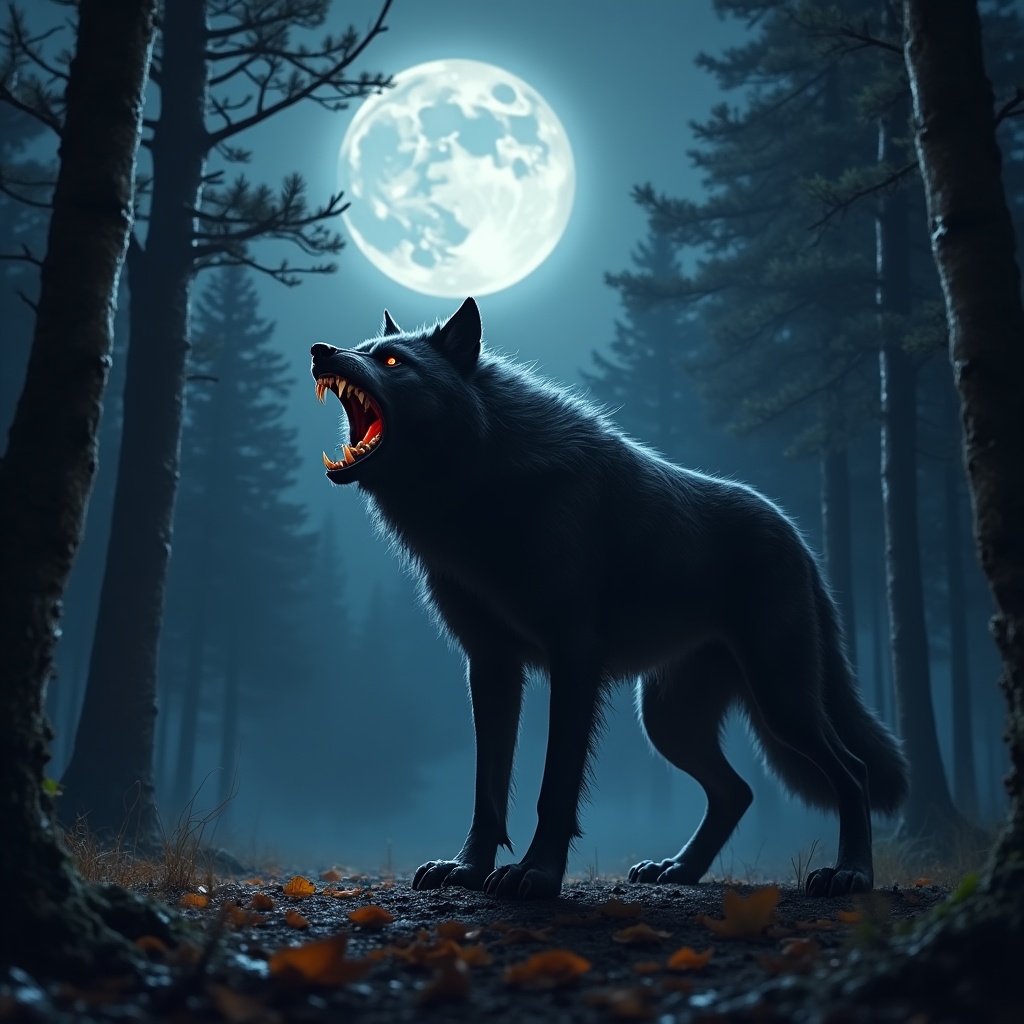 animal illustration, black wolf, coniferous trees, dark forest, digital art, dramatic lighting, fangs, forest background, full moon, howling wolf, illustration, leaves, lunar night, mist, moonlight, moonlit forest, night scene, pine trees, red eyes, spooky wolf, wildlife, wolf howling, wolf