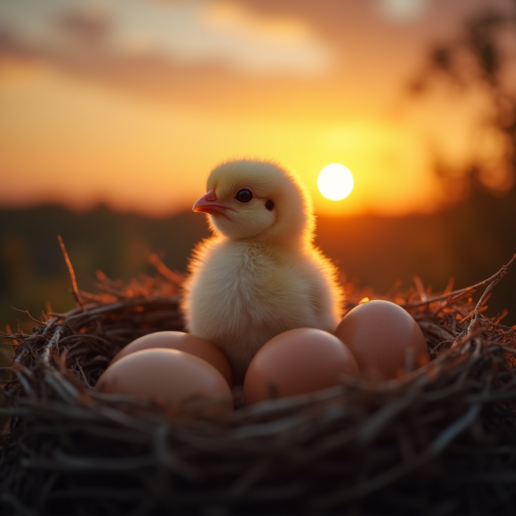 A fluffy yellow chick sits in a nest surrounded by several white eggs. The background features a vibrant orange sunset with a glowing sun and distant green fields. The scene is warmly lit by the setting sun.
