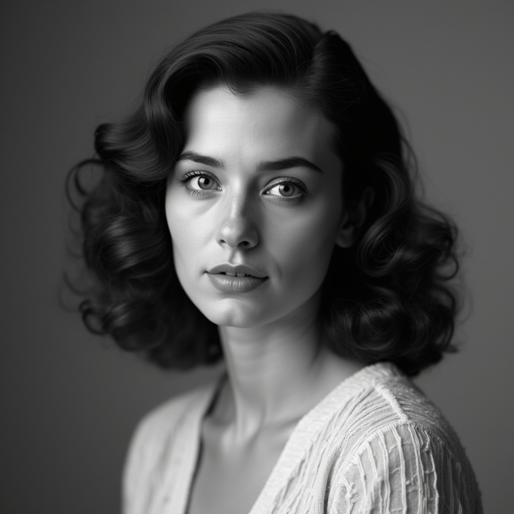 A young woman with voluminous dark wavy hair styled in a vintage 1940s look gazes directly at the camera. She wears a light textured top and has subtle makeup with defined lips. The black and white portrait is set against a plain gray background.