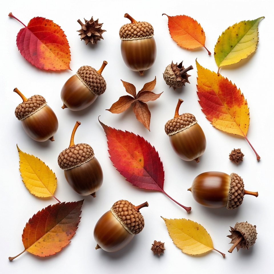 A collection of brown acorns with caps and colorful autumn leaves in shades of red, orange, and yellow is arranged on a white background. Various sizes of acorns and leaves, including some chestnut burs, create a symmetrical fall-themed composition. The flat lay design highlights the textures and vibrant hues of the natural elements.