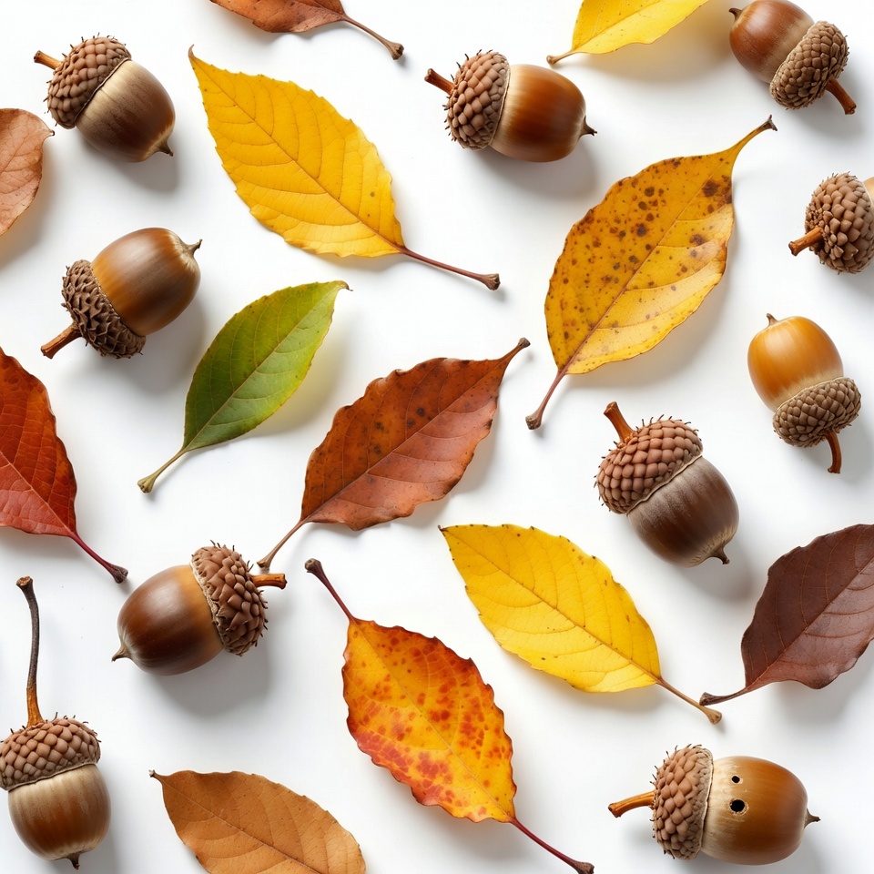 autumn decor, autumn leaves, brown acorns, fall decor, fall leaves, flat lay, foliage, green leaves, harvest, isolated background, leaf arrangement, nature, nuts, orange leaves, red leaves, seasonal, white background, yellow leaves, acorns