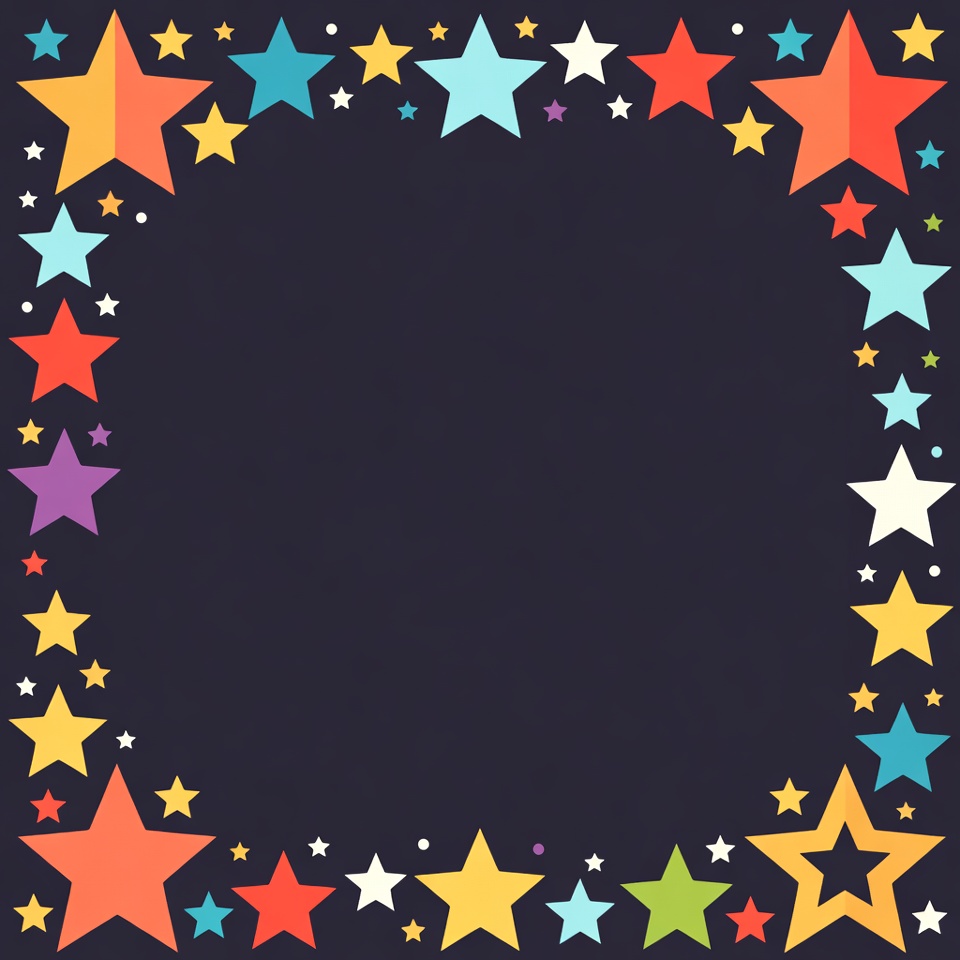 A vibrant border of multicolored stars in various shapes surrounds a large dark empty space. The stars include red, yellow, blue, green, purple, and white five-pointed and outlined designs. The frame is arranged symmetrically on a black background, creating a blank area in the center.