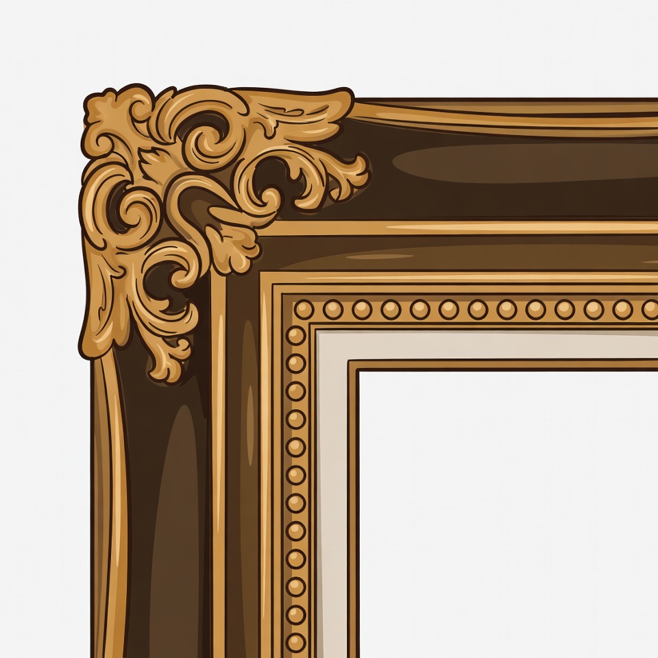 baroque frame, brown frame, classic frame, clipart, decorative frame, empty frame, filigree, frame border, gold frame, golden frame, illustration, isolated background, ornate frame, scrollwork, vector art, vintage frame, white mat, picture frame