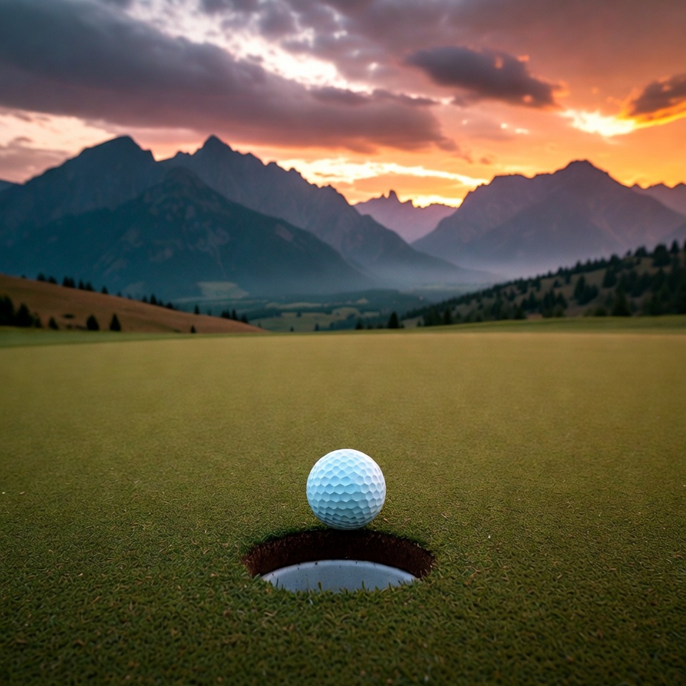 A white golf ball sits perfectly in the cup on a lush green golf course. Jagged mountains rise in the background under a dramatic sunset sky with orange and purple hues. The scene features rolling hills and scattered trees in the foreground.