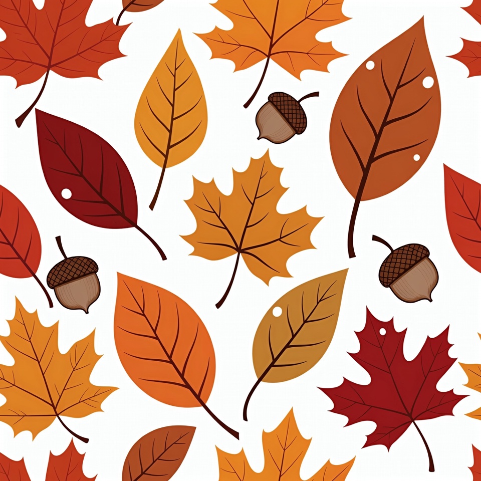 Thanksgiving, acorns, autumn pattern, brown acorns, clipart, fall leaves, fall pattern, foliage, harvest, leaf design, leaf pattern, maple leaves, nature graphic, orange leaves, red leaves, seasonal pattern, vector illustration, white background, yellow leaves, autumn leaves