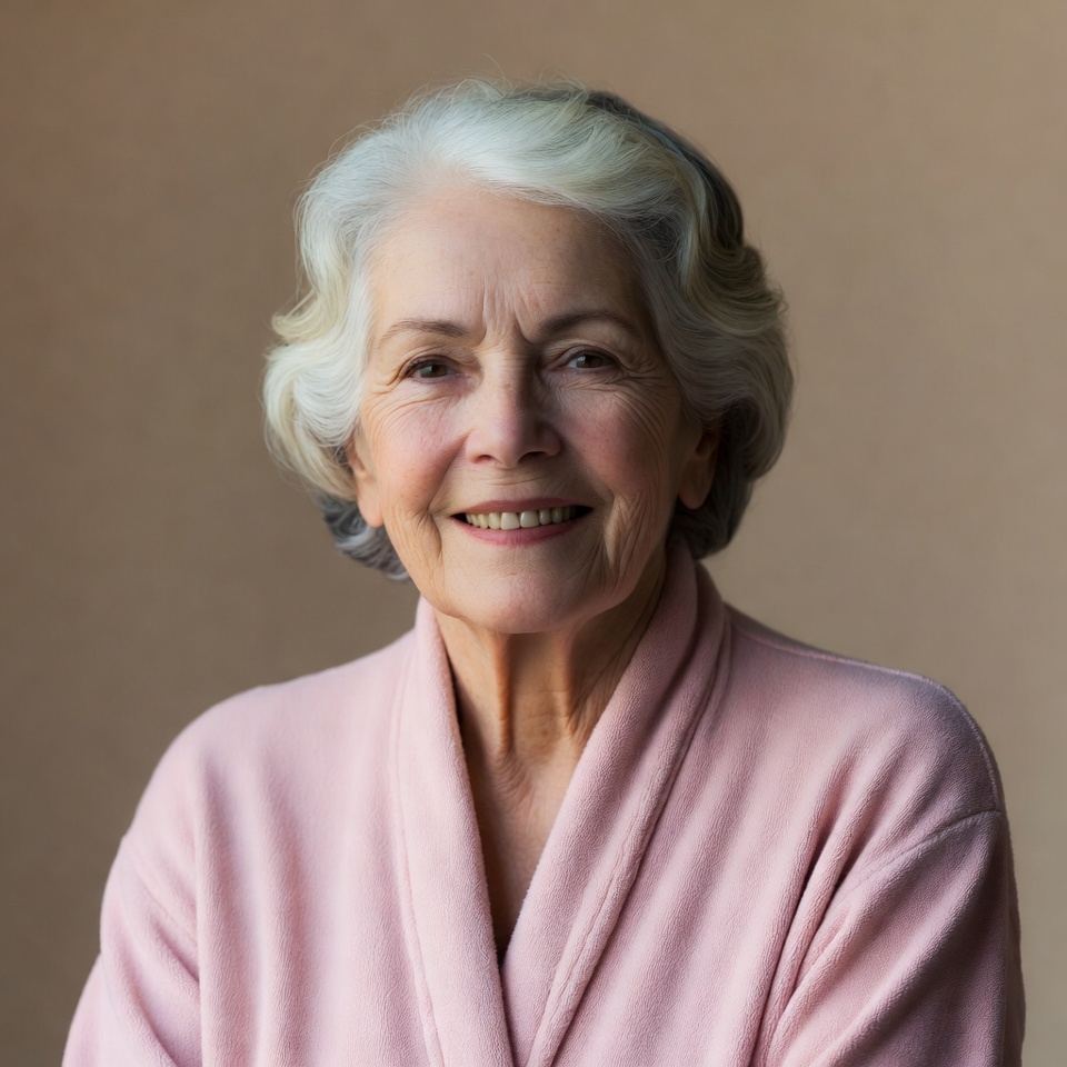 An elderly woman with wavy silver hair smiles warmly at the camera. She wears a soft pink v-neck sweater and stands against a plain beige background. Her expression is gentle with fine wrinkles around her eyes and mouth.