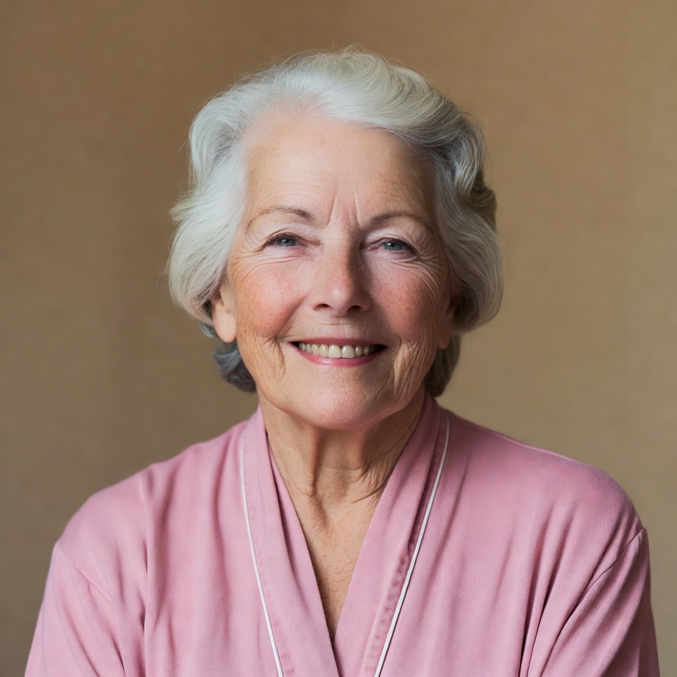 An elderly White woman with silver styled hair smiles warmly at the camera. She wears a pink top with white piping and stands against a beige background. Her expression is gentle with soft wrinkles around her eyes and mouth.