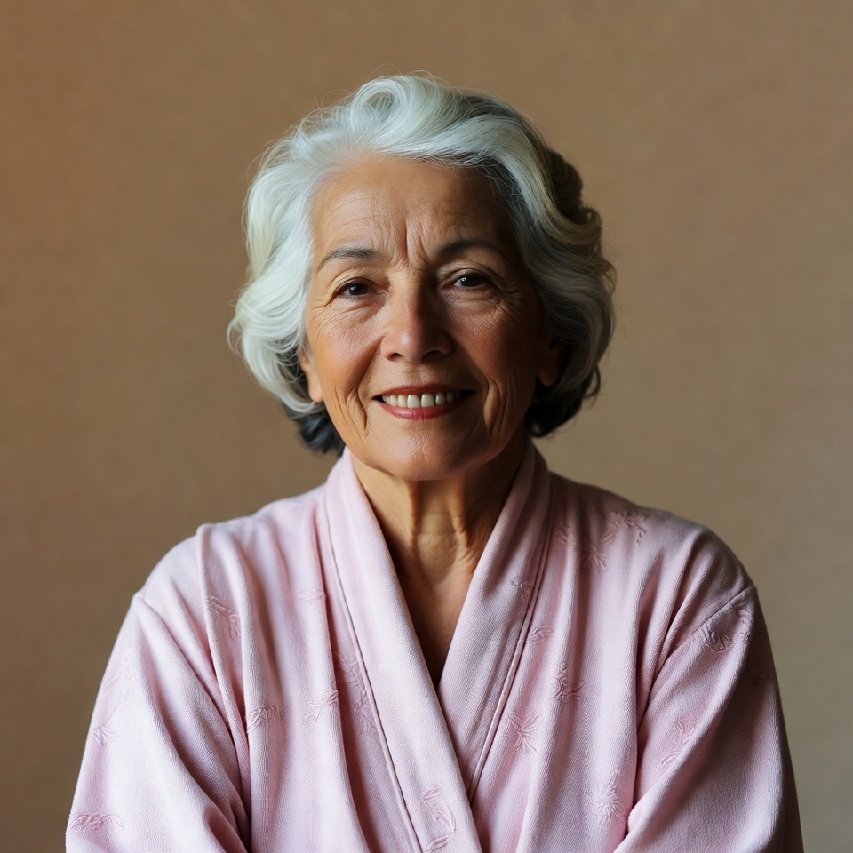 An elderly woman with curly silver hair smiles warmly at the camera. She wears a pink kimono-style robe with a V-neck and folded sleeves. She stands against a plain beige background.