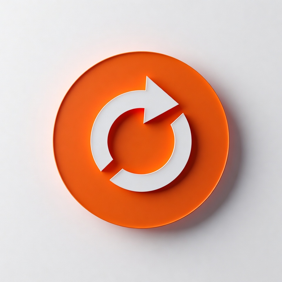 A 3D orange circular icon features a white counterclockwise refresh arrow. The glossy design is isolated on a white background. The arrow symbol suggests rotation or reloading.