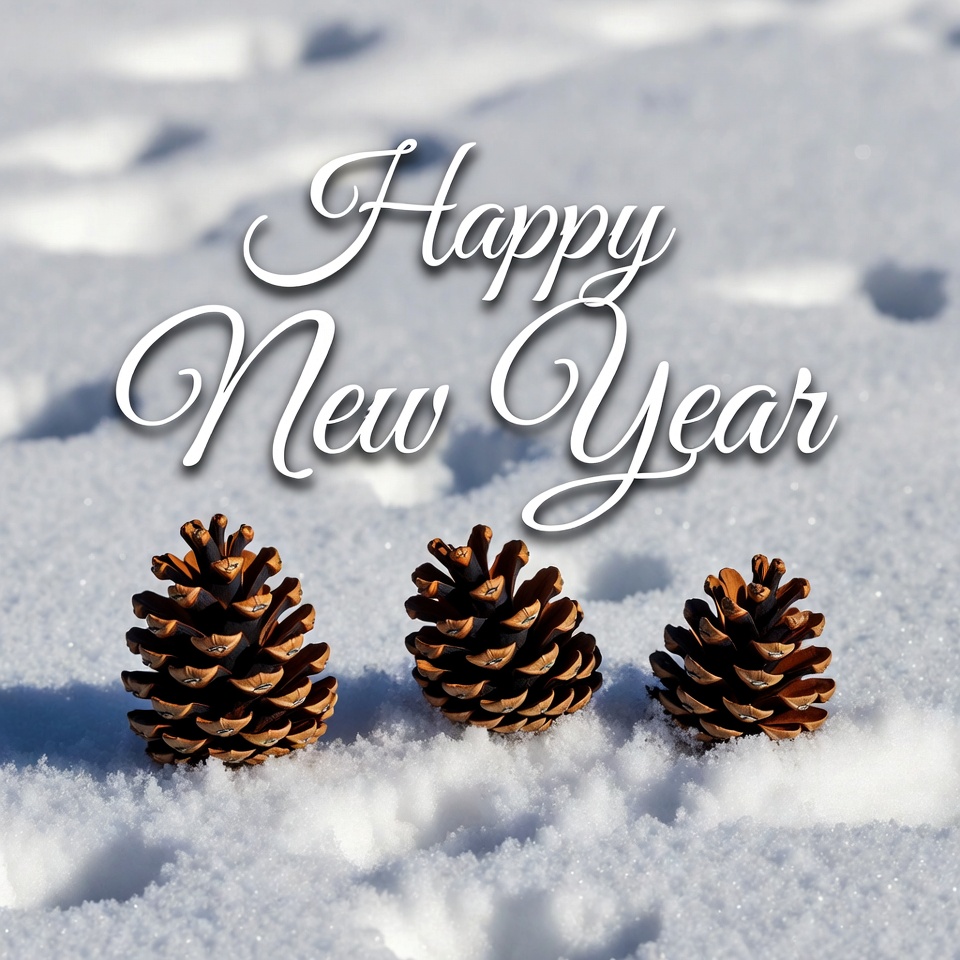 brown cones, celebration, cold weather, cursive text, festive, footprints, fresh snow, holiday greeting, nature, new year, pine cones, seasonal, snow, snowscape, snowy ground, three pinecones, white text, winter, happy new year