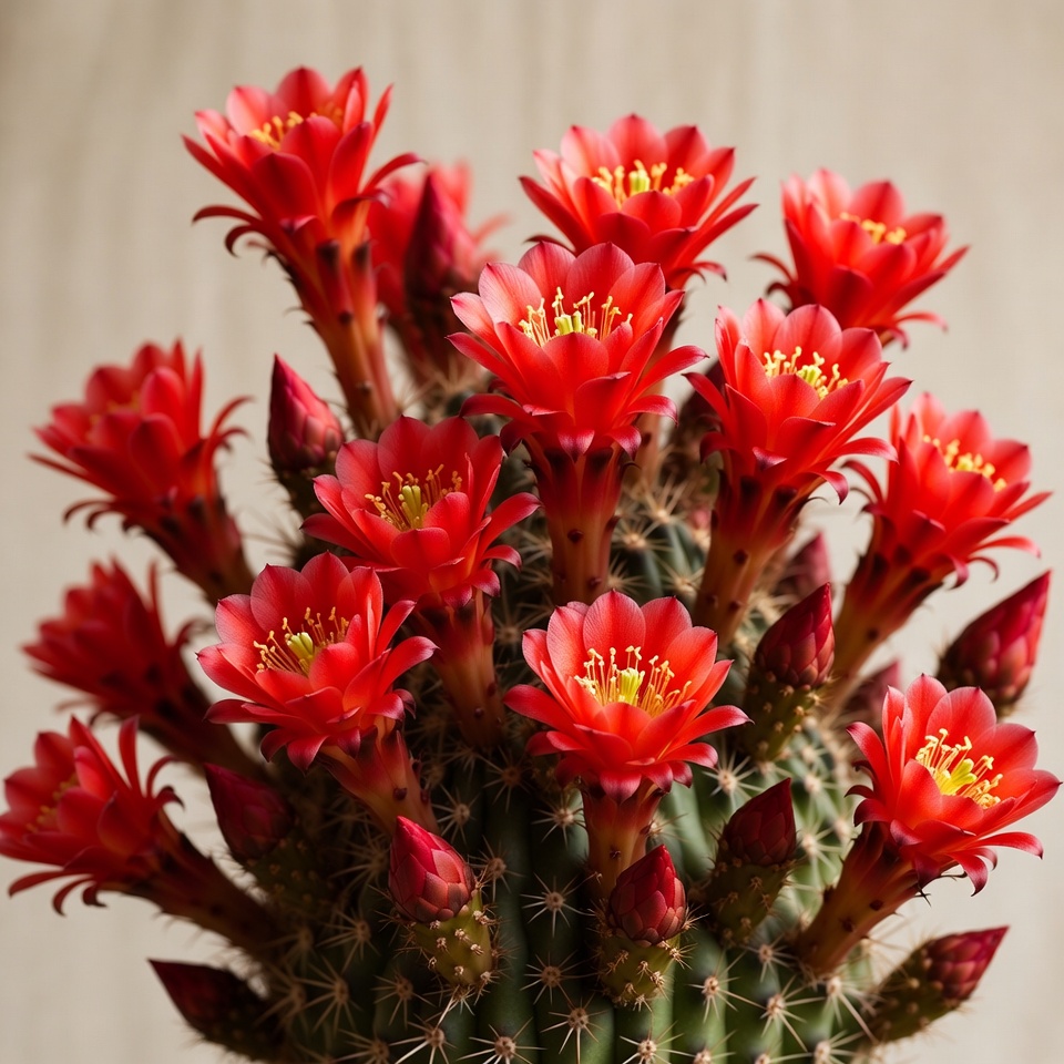 A vibrant Christmas cactus plant features numerous red flowers with yellow centers and spiny green stems covered in buds. The plant is centered against a light beige background, showcasing its clustered blooms and elongated pads. Several flower buds are visible among the fully opened red blossoms.