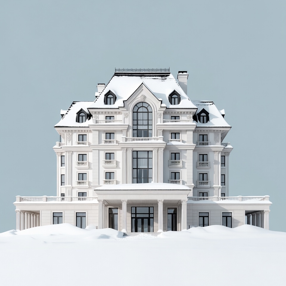 3D render, arched windows, architecture, balcony, building exterior, chateau, cold weather, elegant house, european style, facade, grand mansion, house, isolated background, luxury home, modern mansion, residence, snow, snowy landscape, snowy roof, villa, white building, winter, mansion