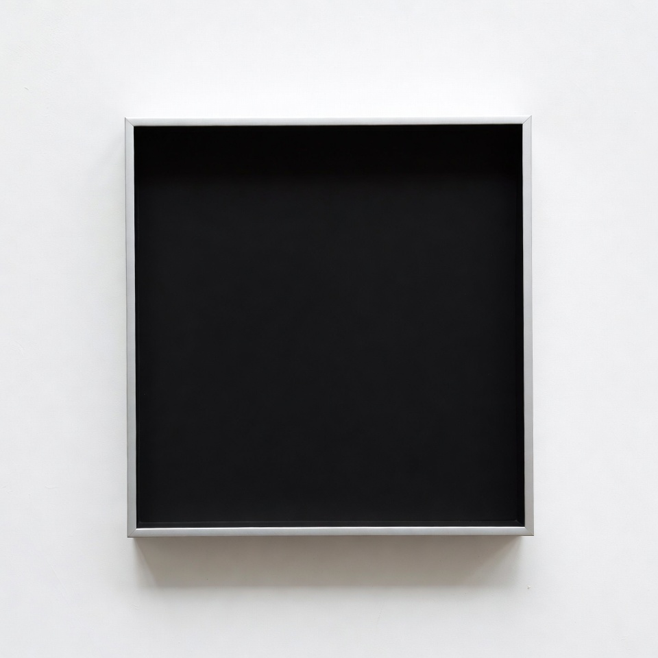 A square black surface is centered within a thin silver frame. The frame and black square are isolated against a plain white background. The composition is simple and minimalist.