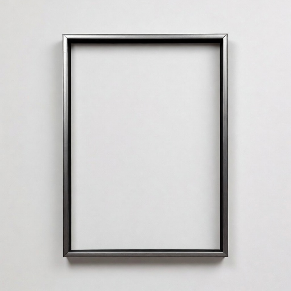 A sleek black picture frame hangs on a plain white wall. The frame is rectangular with a thin metal border and an empty white space inside. It is centered and isolated against the solid background.