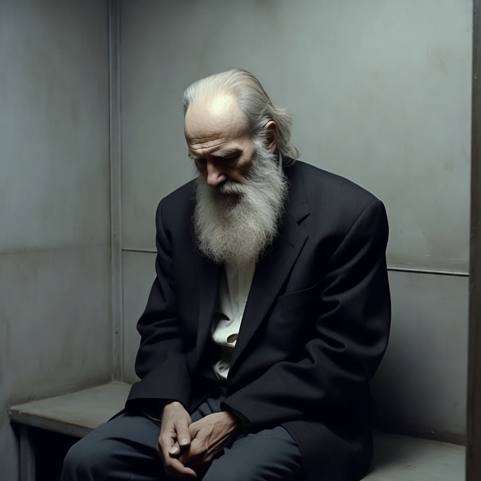 White, bench, dark suit, dim lighting, enclosed room, gray pants, gray wall, hands clasped, long beard, male, old man, sitting, suit jacket, white beard, white hair, white shirt, elderly man