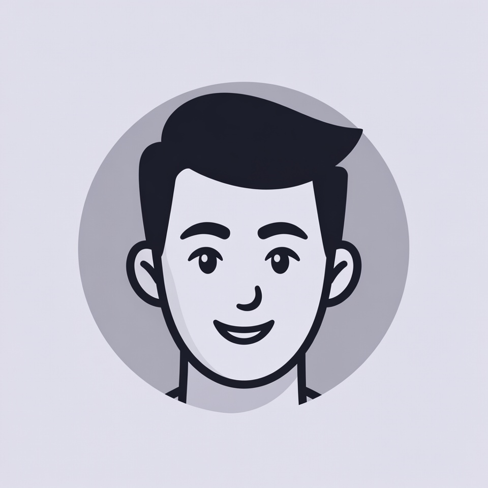 A simple black line art illustration of a young man's face with short dark hair, smiling expression, and friendly eyes. The portrait is centered within a light gray circular background. The style is minimalist and cartoonish with clean outlines.