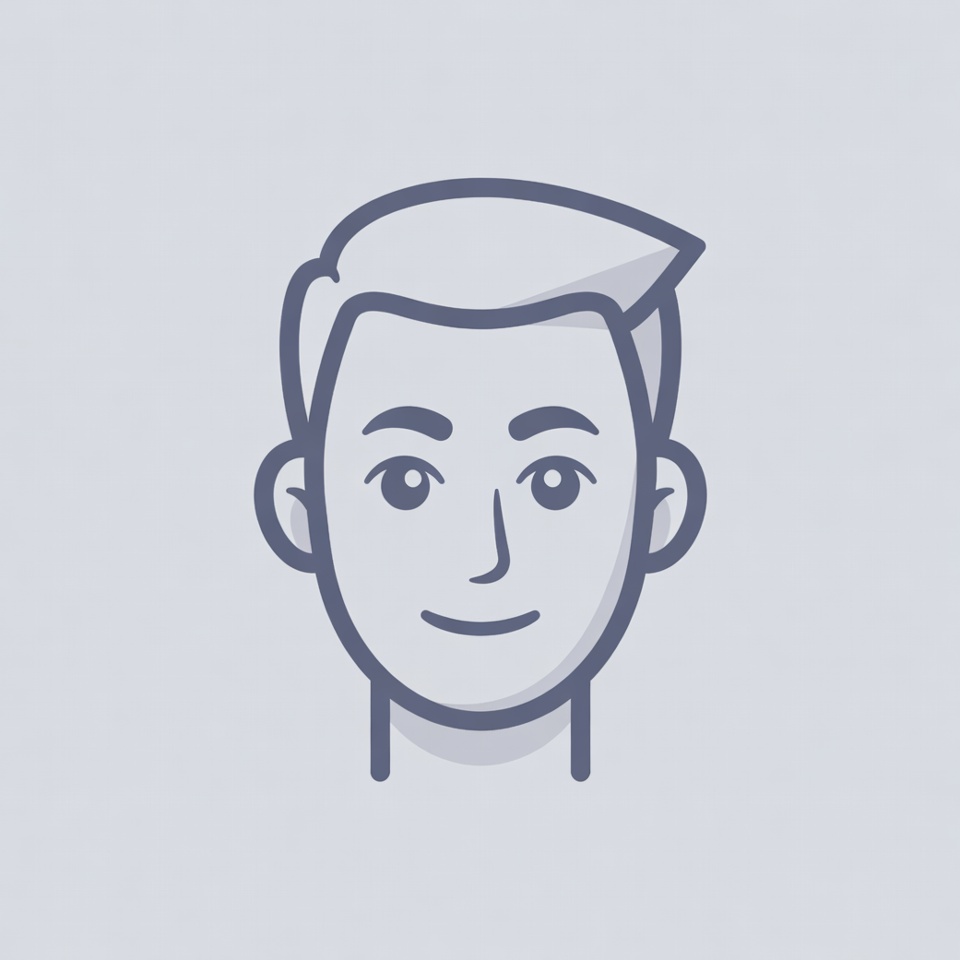 A simple line art illustration of a young man's face with short hair, smiling expression, and outlined features. The design uses thin gray lines on a light gray background. It features large eyes, a small nose, and a gentle smile.