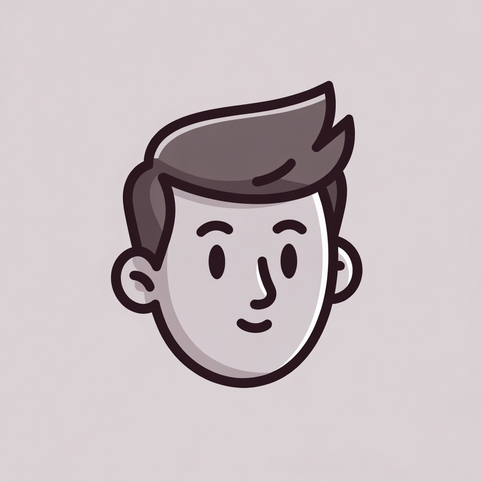 A simple line art illustration of a man's face with short dark hair, smiling expression, and large eyes. The cartoon character is depicted in a minimalist style with thick outlines on a plain light gray background. The design features subtle shading on the hair and face.