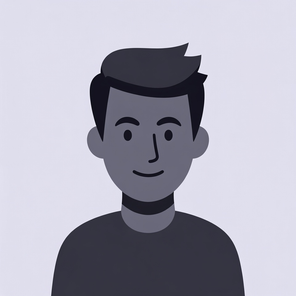 A simple flat illustration of a smiling man with short dark hair and a neutral expression. He wears a dark turtleneck shirt and stands against a light gray background. The design features bold outlines and minimal shading.