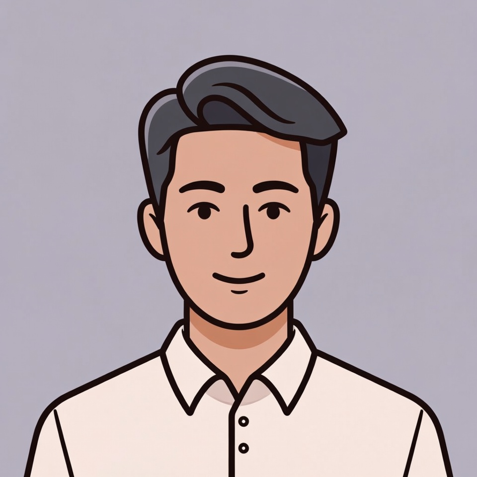 Asian, avatar, cartoon, clipart, collared shirt, dark hair, face, friendly, headshot, illustration, isolated background, line art, male, portrait, short hair, simple drawing, smiling, white shirt, young man, man