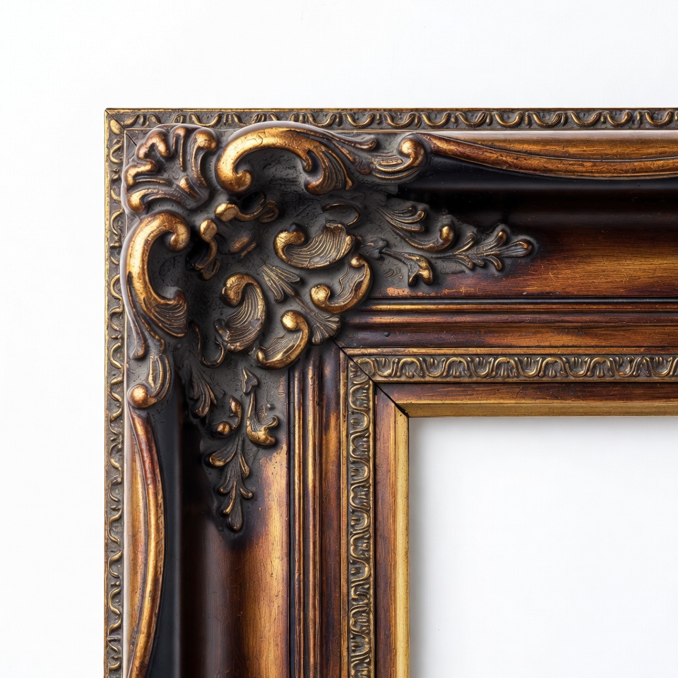 art frame, baroque frame, decorative frame, empty frame, floral carving, frame corner, gold frame, gold ornament, isolated background, ornate frame, photo frame, scrolled edges, vintage frame, white background, wooden frame, picture frame