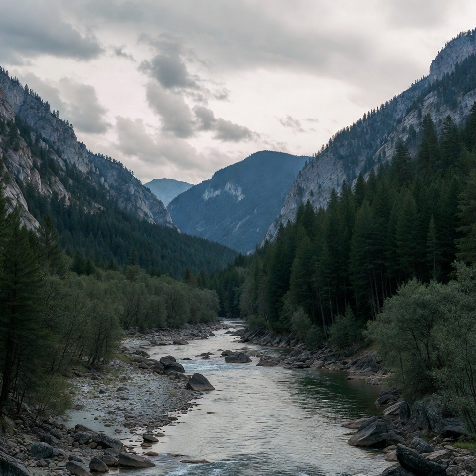 A serene river winds through a deep valley surrounded by steep, rocky mountains covered in dense evergreen forests. The water flows over smooth rocks and reflects the overcast sky. Misty clouds partially obscure distant peaks.