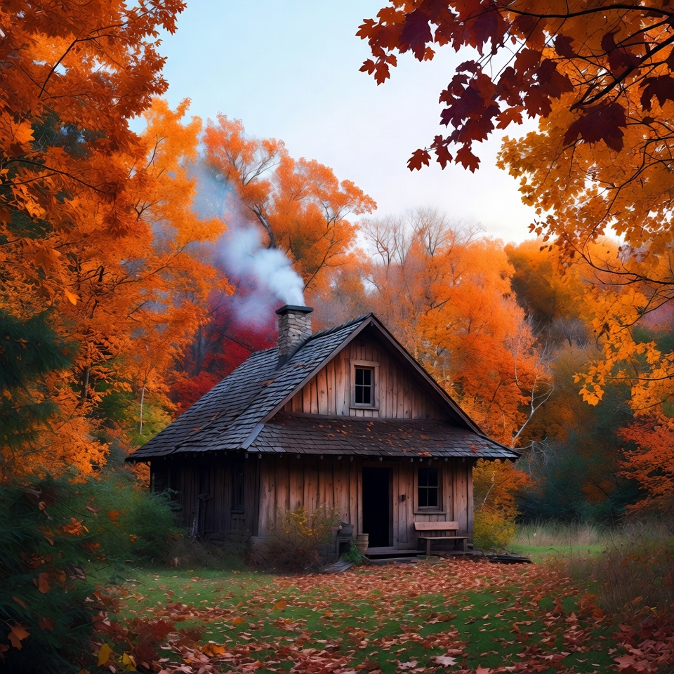 autumn landscape, autumn trees, autumn woods, cabin exterior, cabin porch, chimney smoke, cozy cabin, cozy home, fall forest, fall leaves, foliage frame, forest clearing, log cabin, nature background, orange leaves, red foliage, rustic house, seasonal scenery, slanted roof, stone chimney, vibrant trees, warm colors, wooden cabin, woodland cabin, autumn cabin