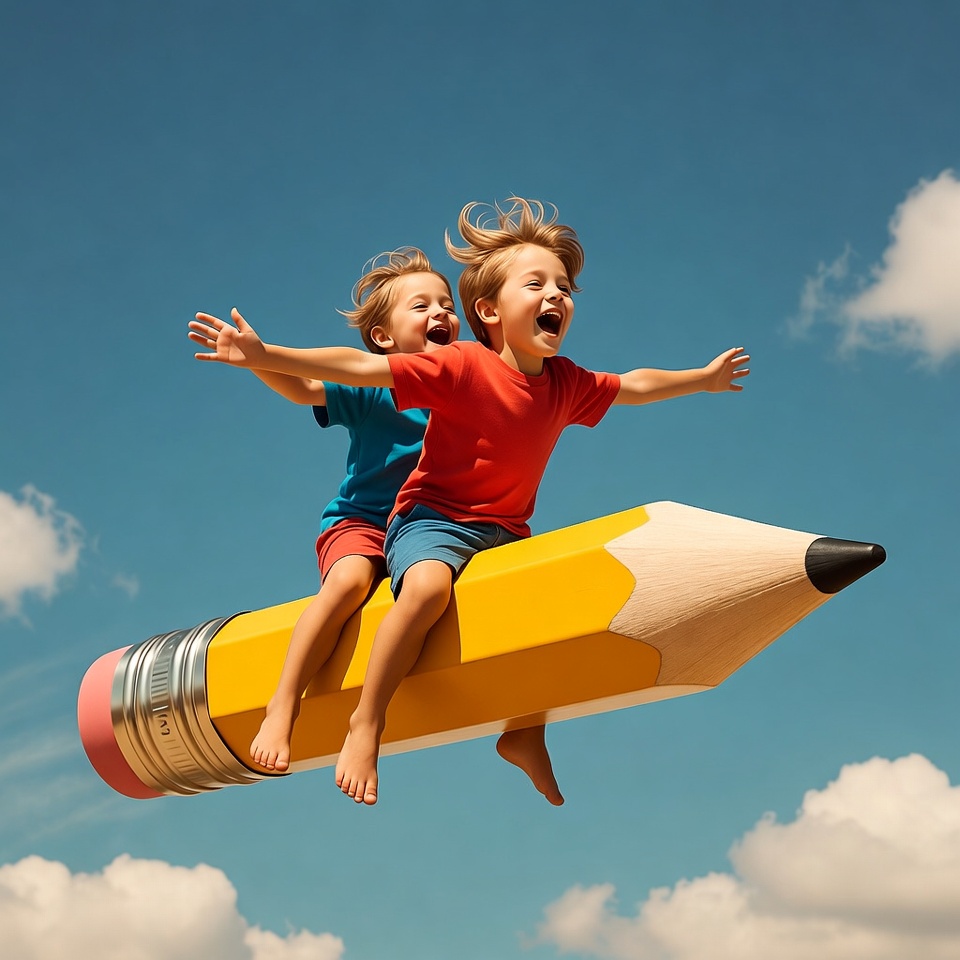 Boys Flying on Giant Pencil