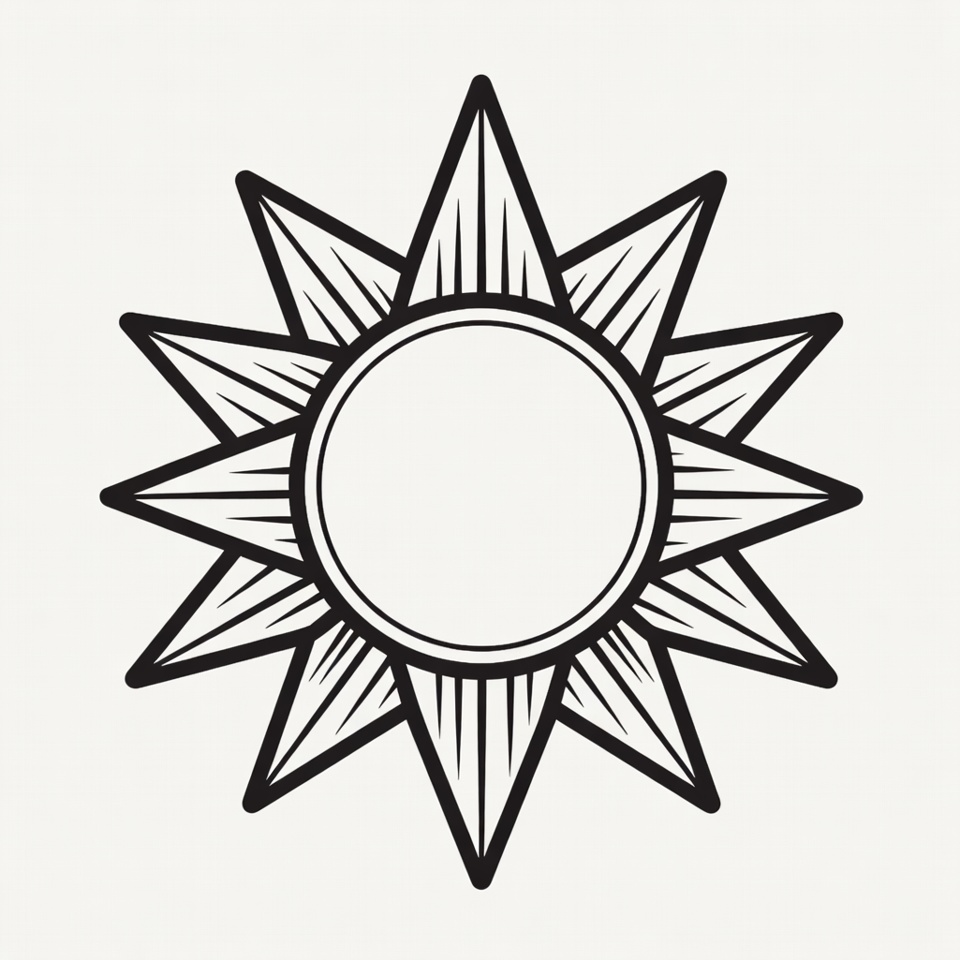 black outline, circular center, clipart, geometric sun, graphic, icon, illustration, isolated background, line art, pointed rays, radiant, rays, simple design, star sun, starburst, sunshine, sunshine icon, symbol, vector, sun