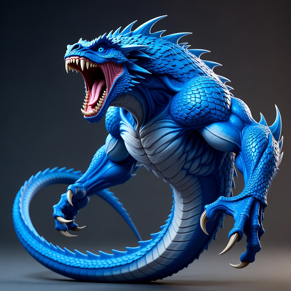 A muscular blue dragon with sharp spines and claws roars ferociously on a dark isolated background. Its serpentine body coils dynamically, showcasing detailed scales and powerful limbs. The digital artwork features vibrant blue tones and dramatic lighting.