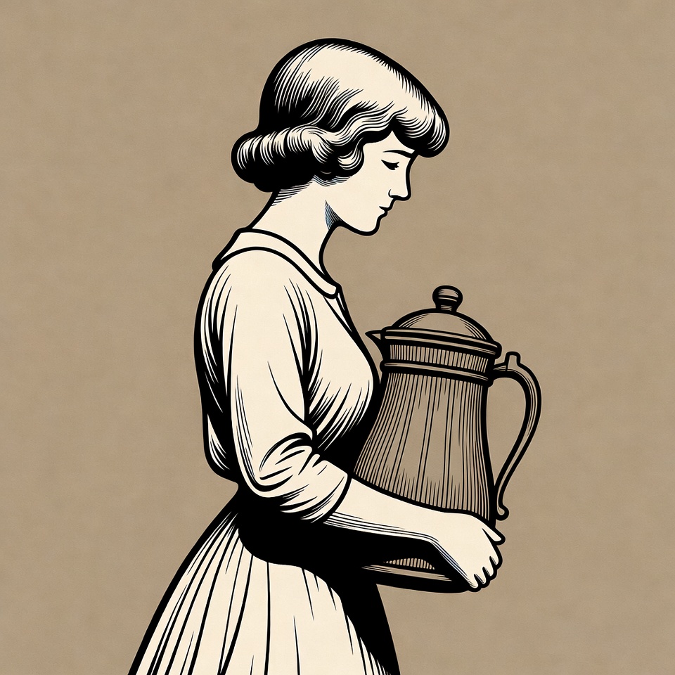 A black and white line art illustration depicts a woman in a vintage dress standing in profile. She holds a large metal coffee pot with both hands against her body. The image features a simple beige background.