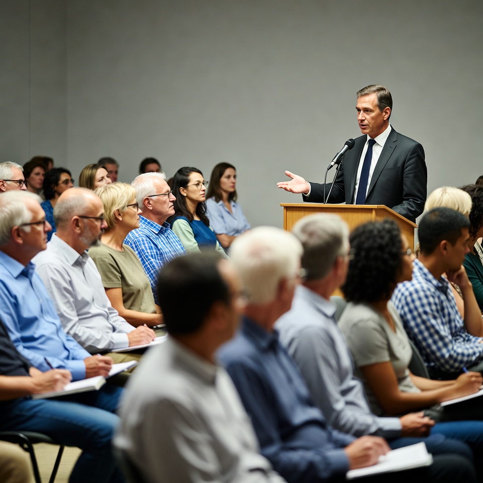 African-American, Asian, Latino, White, attentive, audience, chairs, conference, crowd, diverse group, event, formal attire, gesturing, gray walls, meeting, men, microphone, middle-aged, notebooks, podium, presentation, public speaking, seated listeners, speaker, suit, women, man speaking