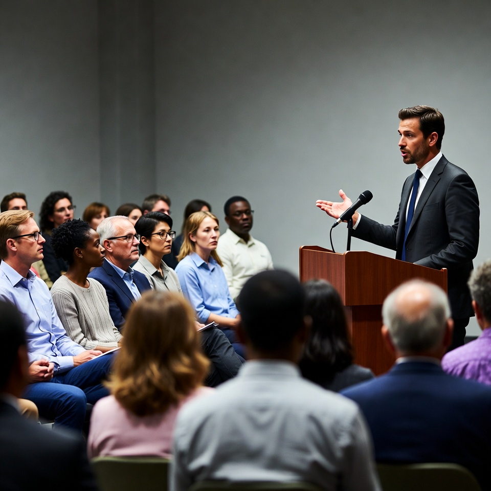 African-American, Asian, Latino, White, audience, business attire, chairs, conference room, corporate meeting, diverse group, formal wear, gesturing, gray walls, men, microphone, podium, presentation, professional event, public speaking, seated listeners, standing speaker, suits, women, business conference