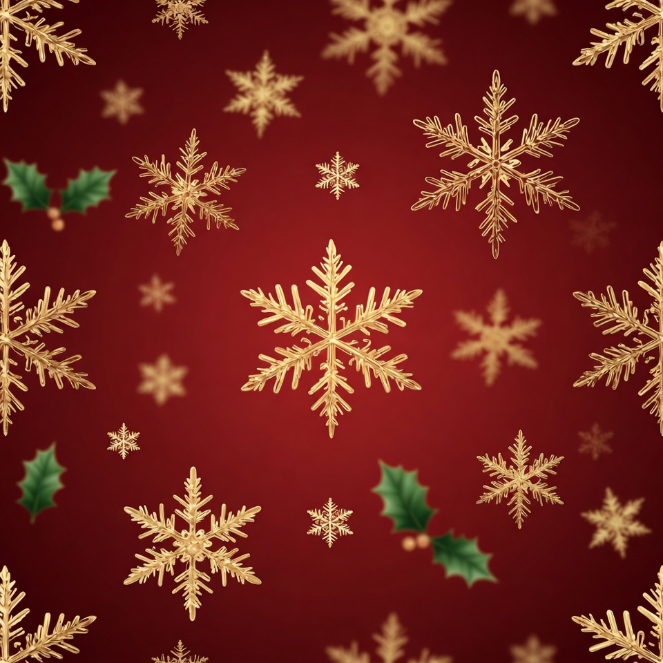 A festive red background features scattered gold snowflakes in various sizes, some with a bokeh effect. Green holly leaves with red berries add holiday accents among the snowflakes. The seamless pattern is ideal for Christmas designs.