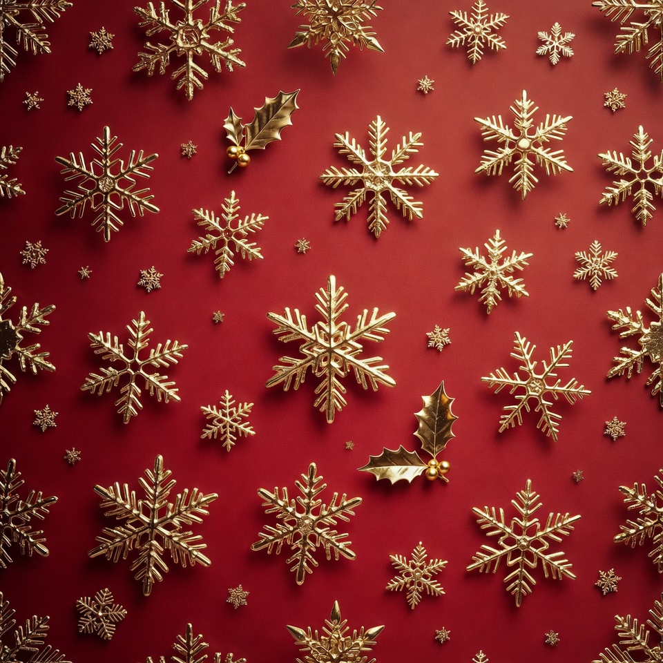 Christmas decoration, Christmas snowflakes, festive design, gold flakes, golden snowflakes, holiday background, holly berries, holly leaves, metallic gold, red background, red surface, shiny snowflakes, snowflake pattern, snowflakes, winter decor, winter pattern, gold snowflakes