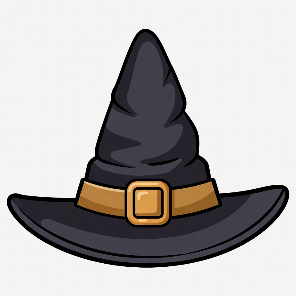 Halloween, black hat, buckle, cartoon, clip art, clipart, illustration, isolated background, magic hat, orange buckle, pointed hat, spooky hat, vector, witch costume, witch hat