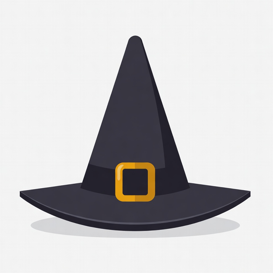 Halloween hat, black hat, clipart, costume accessory, illustration, isolated background, magic hat, pointed hat, spooky hat, vector graphic, wide brim, yellow buckle, witch hat