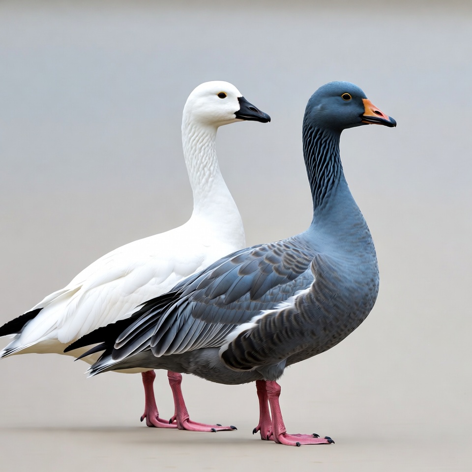 avian, bean goose, birds, black wings, feathers, geese, gray goose, isolated background, orange beak, orange feet, pair, snow goose, standing, two geese, water birds, waterfowl, wildlife, white goose