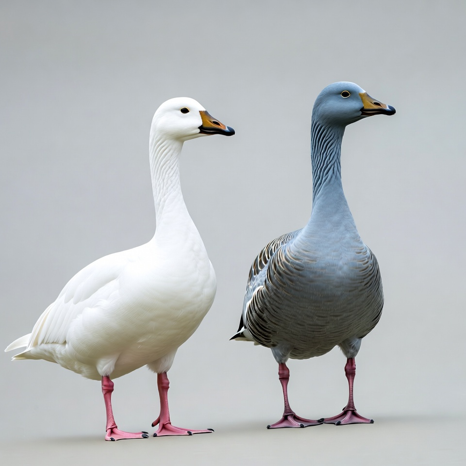 A white goose with orange beak and pink feet stands next to a gray goose with similar features on a plain gray background. Both geese face forward with long necks extended. Their feathers are detailed, showing subtle patterns on the gray one.