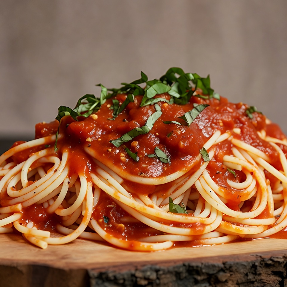 Italian food, appetizing, basil leaves, carbs, closeup, cuisine, dinner, food photography, food styling, fresh basil, glossy sauce, gourmet pasta, isolated background, marinara, meal, noodles, pasta, plate-free, red sauce, savory dish, tomato chunks, tomato sauce, wooden board, spaghetti