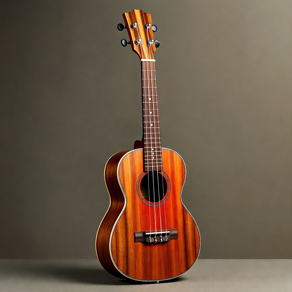 brown wood, frets, glossy finish, headstock, isolated background, musical instrument, orange ukulele, small guitar, sound hole, string instrument, strings, studio shot, tuning pegs, wooden ukulele, ukulele