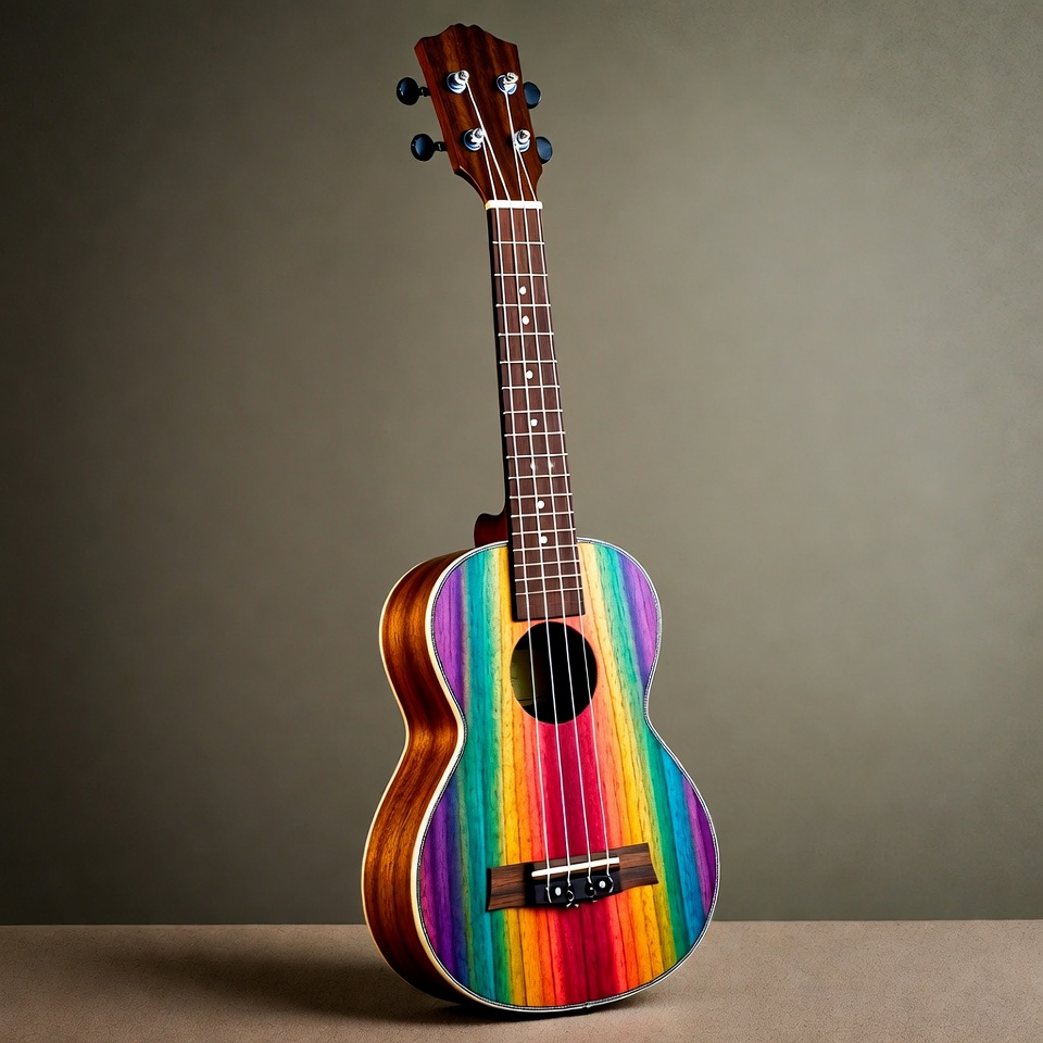 colorful ukulele, four strings, gradient finish, isolated background, musical instrument, rainbow colors, rainbow ukulele, sound hole, string instrument, wood table, wooden body, ukulele