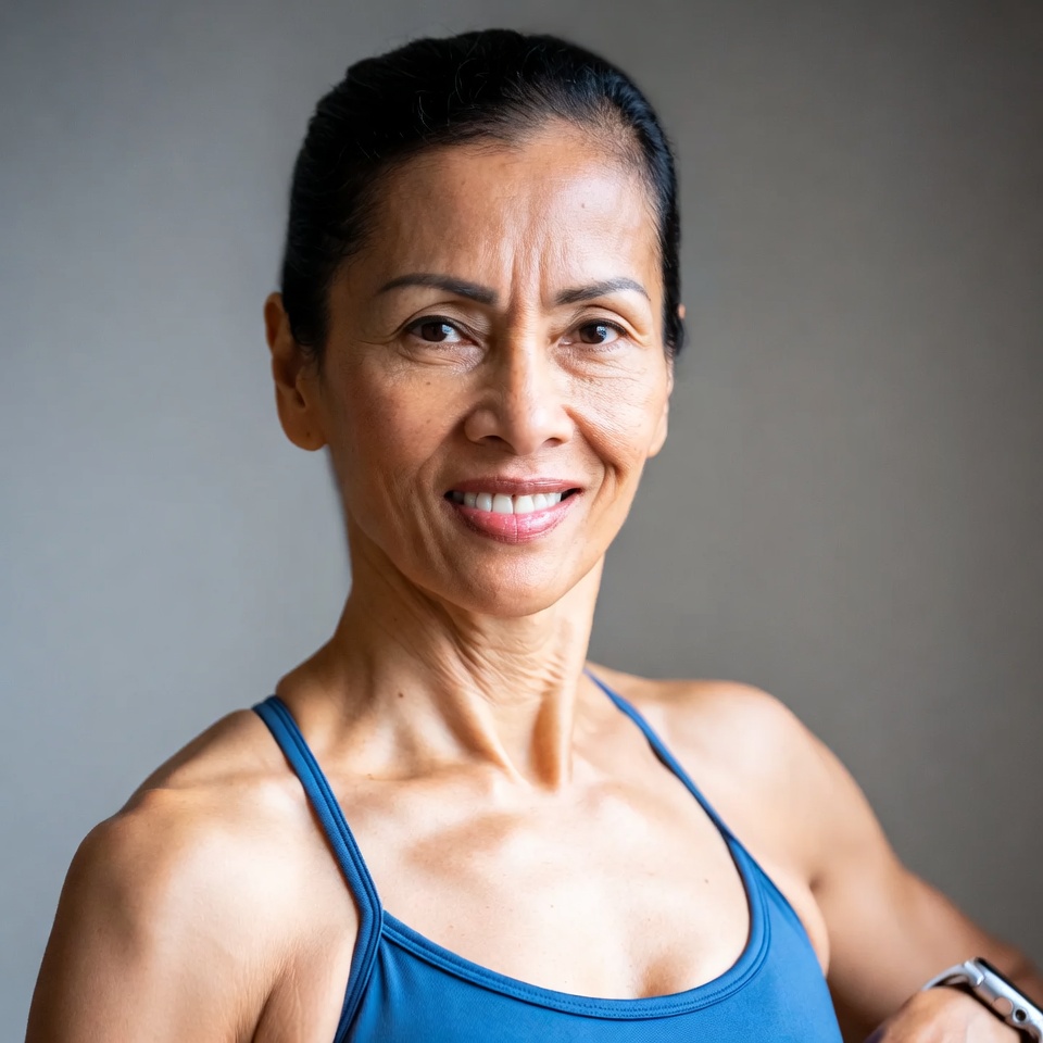 A mature Asian woman with dark hair in a bun smiles warmly at the camera. She wears a sleeveless blue tank top that highlights her toned shoulders and arms. She stands against a plain gray background with a fitness tracker on her wrist.