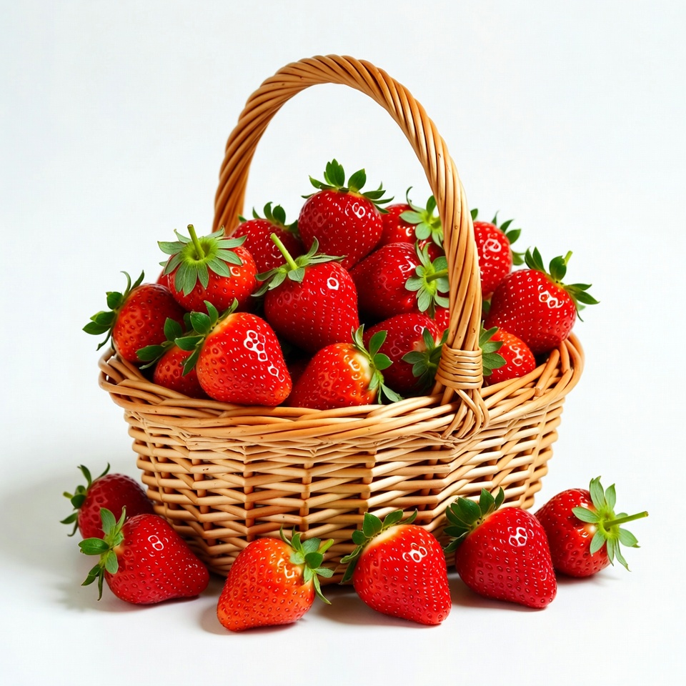 A wicker basket overflows with fresh red strawberries on a white background. Some strawberries spill out around the base of the basket. The strawberries have vibrant green leaves and stems.