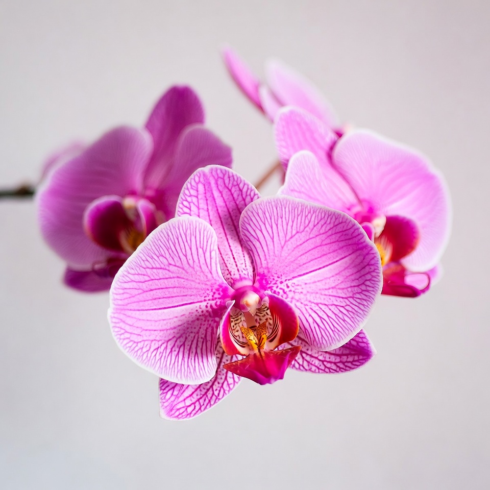 blooming flowers, botany, closeup, exotic flower, floral, flowers, green stems, isolated, nature, petals, phalaenopsis, phalaenopsis orchid, pink flowers, pink orchid, plant, tropical flower, veined petals, white background, yellow center, orchid