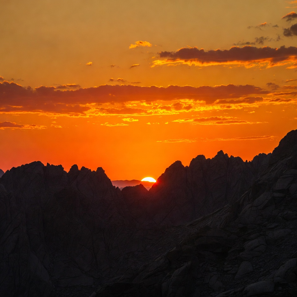 alpine sunset, clouds, dramatic sky, golden hour, horizon, jagged peaks, landscape, mountains, nature, orange sky, outdoor scenery, rocky peaks, silhouetted mountains, warm colors, sunset